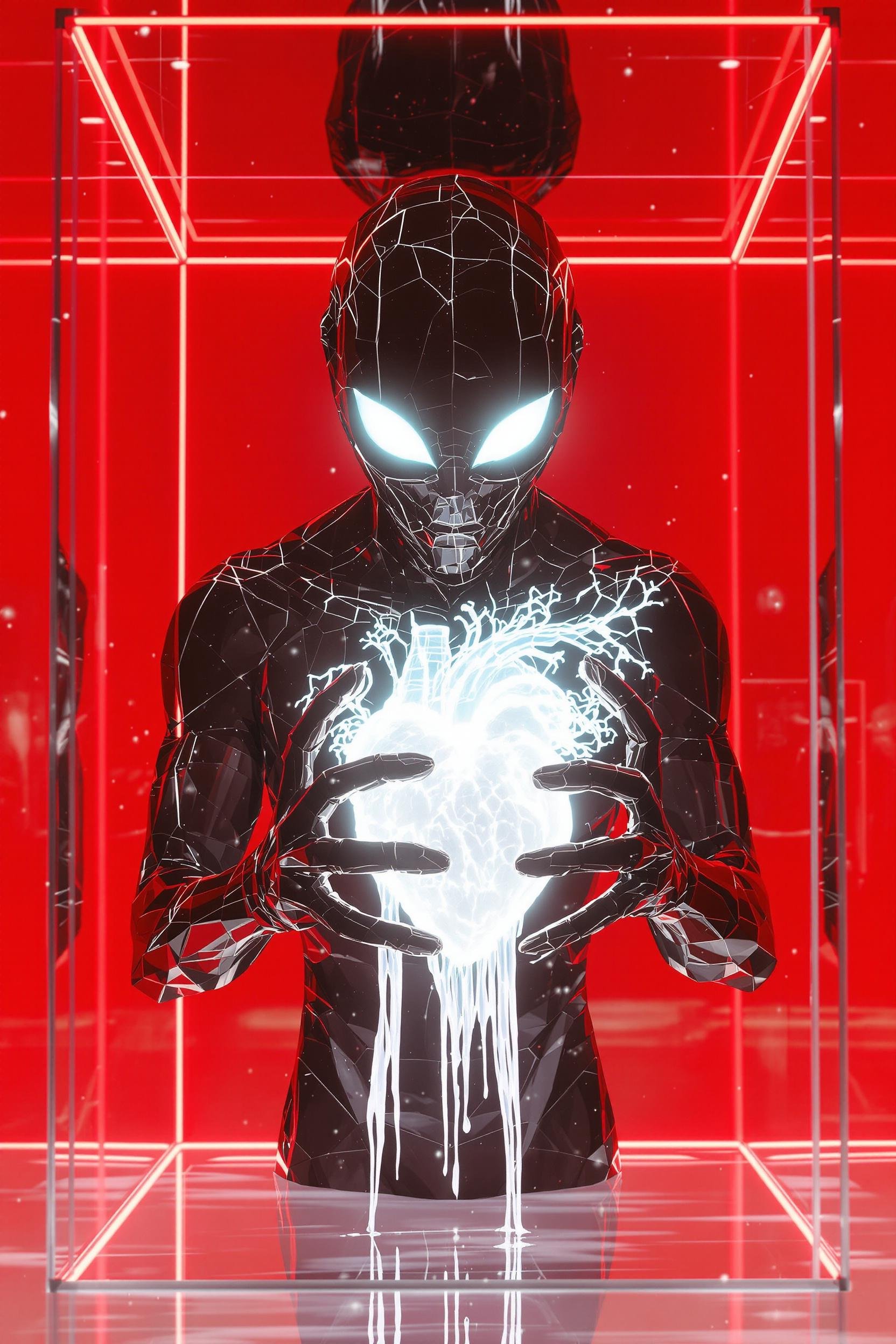 an alien made of obsidian and slimy darkness with glowing white eyes stands inside a thin translucent giant glass cube in the middle of a red neon void. inside the cube he holds a melting small organic human heart made of neon white liquid. photorealistic
