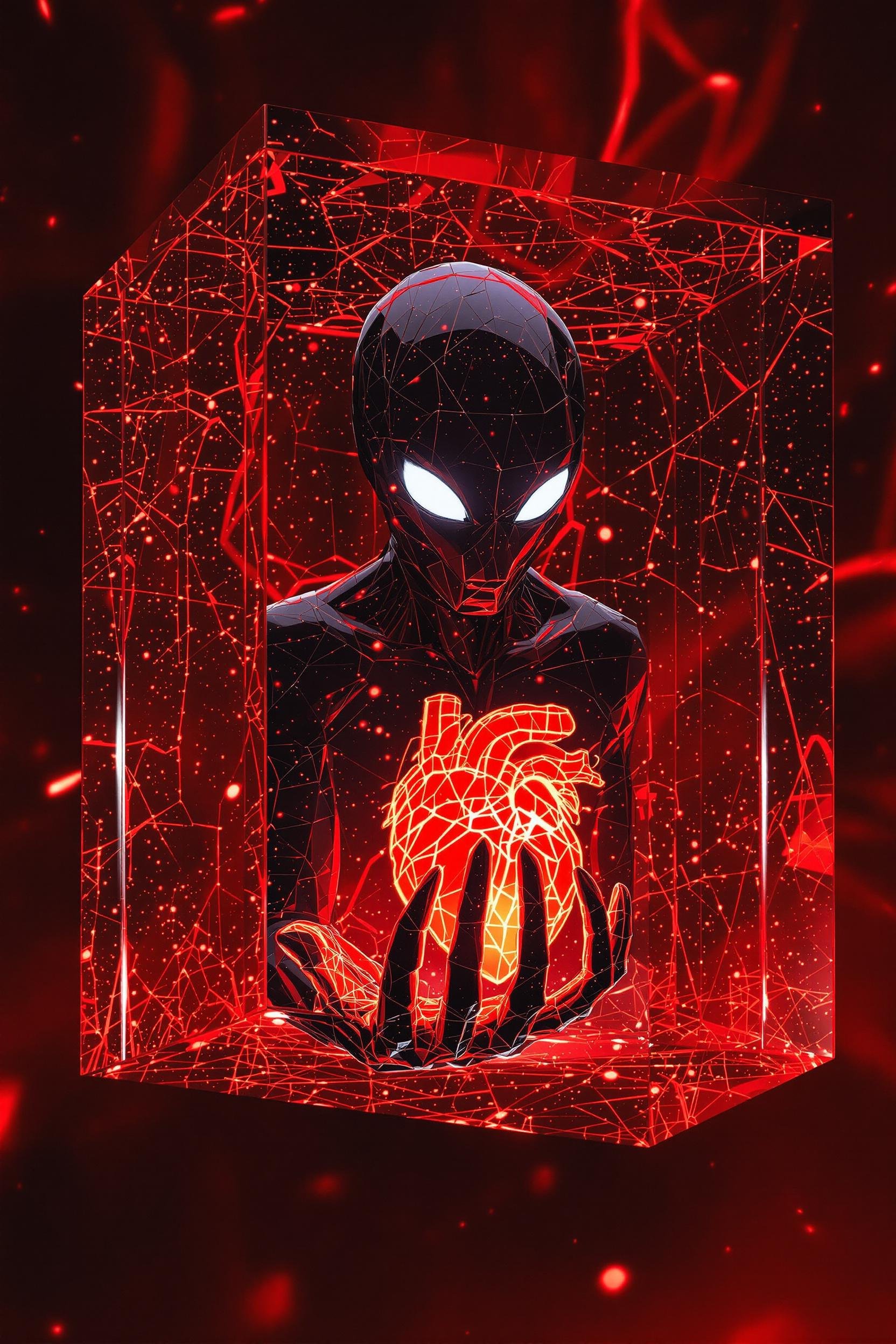 an alien made of obsidian and slimy darkness with glowing white eyes stands inside a thin translucent giant glass cube in the middle of a red neon void. inside the cube he holds a melting small organic human heart made of neon white liquid. photorealistic