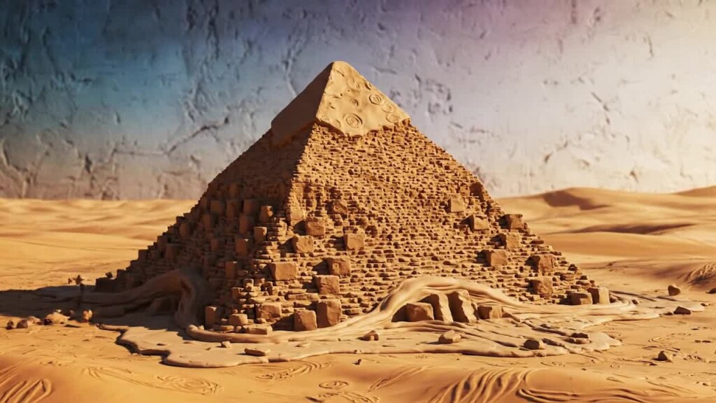 [DOUGHMOTION PROMPT EXPANDER] The Claymation Great Pyramid - Ancient Wonder Genesis" Visual and Art Direction (for the entire clip): "Craft a wide, majestic scene in the distinct style of classic stop-motion claymation, emphasizing a subtly 'step-frame' or 'jerky' animation quality rather than smooth motion, to enhance the handcrafted feel. Feature matte, handmade textures and subtle fingerprints visible on all surfaces, giving it a tangible, sculpted feel. Utilize a diverse, slightly desaturated, yet clearly distinct and balanced color palette. Focus on a rich spectrum of muted desert tones – golden tans, sun-baked ochres, light creams, and subtle greys for the pyramid blocks and surrounding sand. Contrast this with vast, desaturated blues and light purples for the sky, perhaps with a hint of a distant, muted sun. Avoid a monochromatic look; ensure clear color separation and grandeur suitable for classic claymation. Lighting should be soft and even, simulating the expansive desert light without harsh shadows, to emphasize the sculpted forms. The overall atmosphere should be charmingly imperfect, handcrafted, and awe-inspiring, conveying ancient majesty and monumental scale, highlighting the material's malleability and the tactile nature of clay." Audio Directive: "No music is to be added to this clip. The audio should consist solely of satisfying, exaggerated claymation sound effects – deep rumbling, colossal stretching, settling, grinding of stone-like clay, and subtle ambient desert wind sounds." Episode Flow (One Continuous Shot Description): Description: A continuous, wide, static shot from a slightly elevated perspective, overlooking a vast, flat expanse of textured clay desert sand. The background features a distant, flat clay horizon and a vast, textured clay sky with muted blue and cream tones. The focus is initially on an empty section of the desert where the pyramid will emerge. The animation within the clip should subtly convey a stop-motion feel. Phase 1 (Initial State - Empty Desert): The shot begins with an undisturbed, flat expanse of textured clay desert sand, stretching into the distance. Phase 2 (Pyramid Emergence & Construction): From beneath the desert's surface, a colossal, square base of clay rapidly begins to fluidly rise, undulate, and continuously expand upwards. This emerging structure organically stretches, flows, and sculpts itself with remarkable elastic continuity, seamlessly building the massive, layered blocks of a claymation Great Pyramid. Each block, textured like weathered sandstone in golden tans and ochres, individually forms and accretes, stacking upon one another as the pyramid grows layer by layer towards its iconic apex. The entire pyramid grows vertically and solidifies through this dynamic, flowing movement, its diverse textures and colors appearing as the clay stretches and solidifies into shape, emphasizing the organic, 'goopy' flow of the material, where nothing appears abruptly, but rather grows and transforms from the desert floor. The accompanying sound effects are deep rumbling, colossal stretching, and a subtle grinding of stone-like clay. Phase 3 (Final State - Fully Formed Great Pyramid): The magnificent claymation Great Pyramid stands fully formed, detailed, and monumental, dominating the desert scene. Its iconic stepped structure, massive blocks, and weathered sandstone textures showcase a rich, diverse, yet desaturated earthy color palette. Visible clay textures are prominent, giving it a tactile, handcrafted, yet truly ancient and grand feel, as if it has just finished organically growing and assembling itself from the desert. The final audio settles into subtle ambient desert wind sounds.