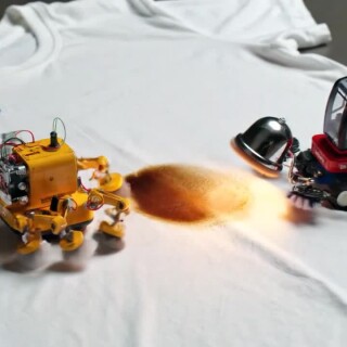 Tiny non-anthropomorphic construction robots scrubbing a coffee spill off a tee shirt. The robots are designed to be efficient helpers that always over complicate their task. They have built in mechanisms that help them do their tasks in an absurd way. They end up burning the fabric on accident.