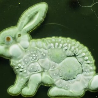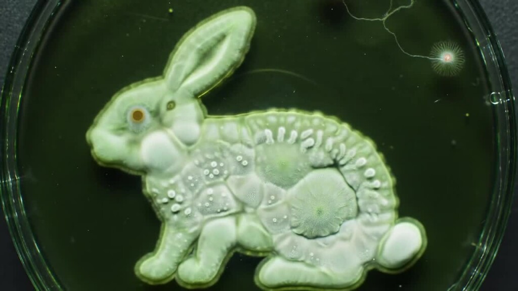 An animated time-lapse of growing agar art inside a petri dish, macro lens, showcasing intricate microbial and fungi colonies forming a detailed moving animated moving rabbit. The agar highlights the textures and patterns of the microorganisms. evolving artwork. rabbit moving