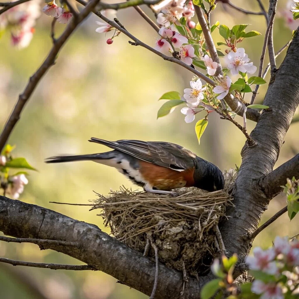 Sunlight dapples through budding branches, illuminating a vibrant tapestry of greens and browns as a pair of robins meticulously weave twigs and mud into a cradle of life, their tiny forms a whirlwind of activity against a backdrop of blossoming spring. The scene unfolds with a gentle, observational pace, allowing the viewer to fully appreciate the intricate details of nest construction, the soft textures of downy feathers contrasted against the rough bark of the branches, the delicate balance of strength and fragility in their creation.