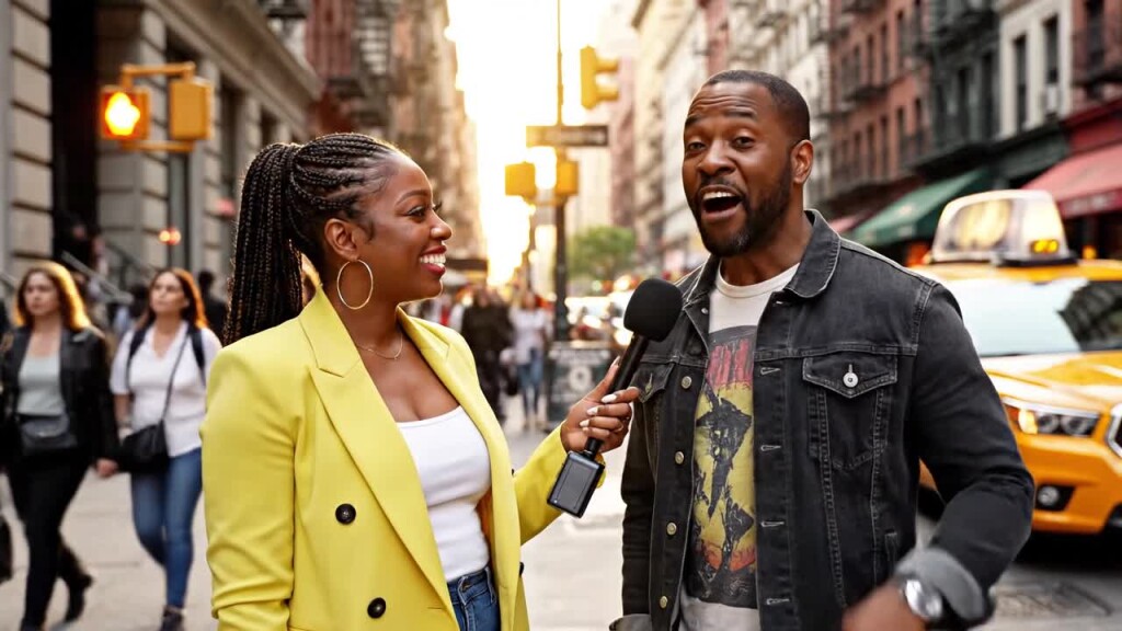 Two person street interview in New York City. Sample Dialogue: Host: "Did you hear the news?" Person: "Yes! Veo 3.1 is now available on fal. If you want to see it, go check their website."