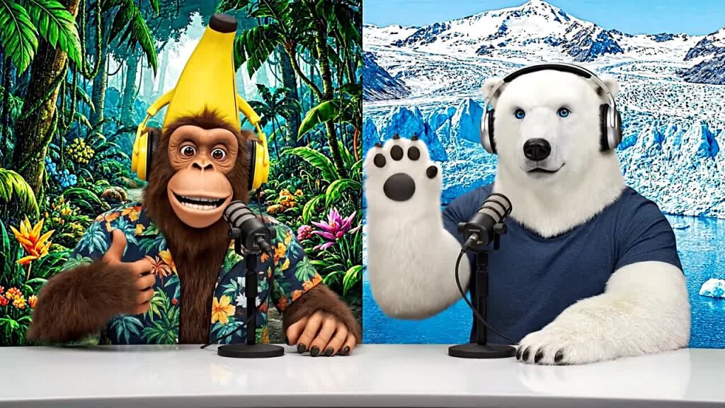 A monkey and polar bear host a casual podcast about AI inference, bringing their unique perspectives from different environments (tropical vs. arctic) to discuss how AI systems make decisions and process information.